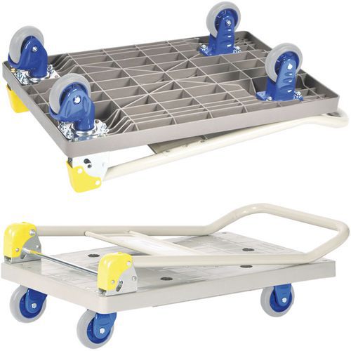 | Varenavn | Plattformvogner av plast 150 kg med bøyle, Kapasitet: 150 kg, Totalhøyde: 1050 mm, Totalbredde: 450 mm |
