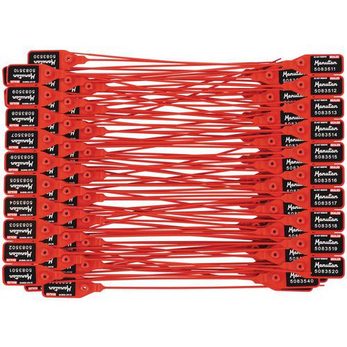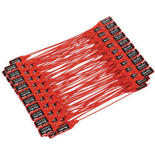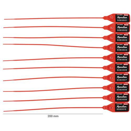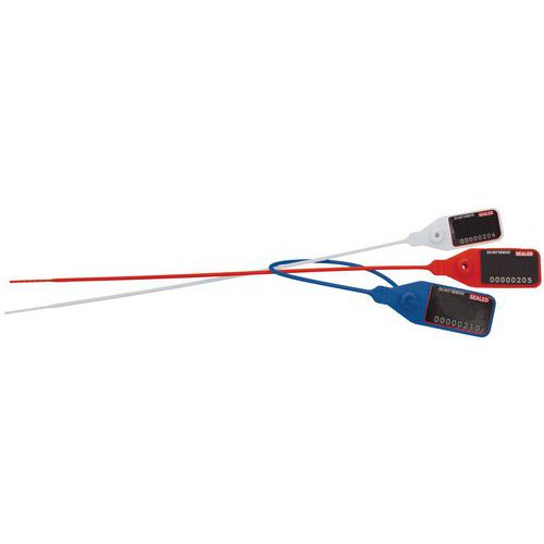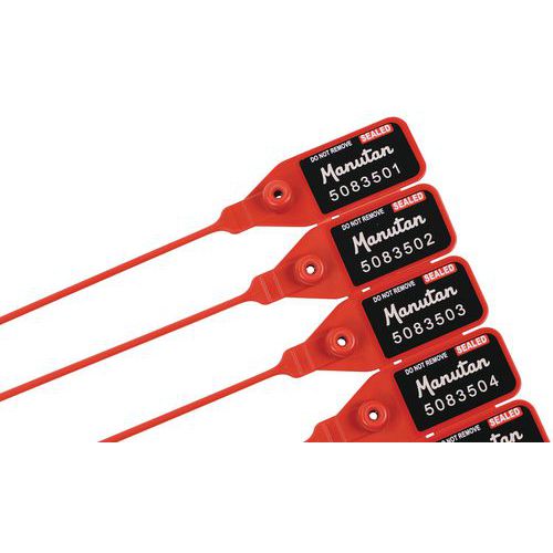 Tåler temperaturer mellom –30 og +40 °C. Låsemekanisme av metall. Identifikasjonsnummer. Lukking med flatt bånd.