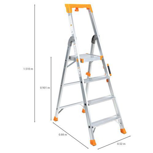 Profesjonell trappestige i aluminium, Tilgangshøyde: 2.9 m, Plattform, høyde: 0.901 m, Antal trin: 4 Profesjonell trappestige i aluminium, Tilgangshøyde: 2.9 m, Plattform, høyde: 0.901 m, Antal trin: 4