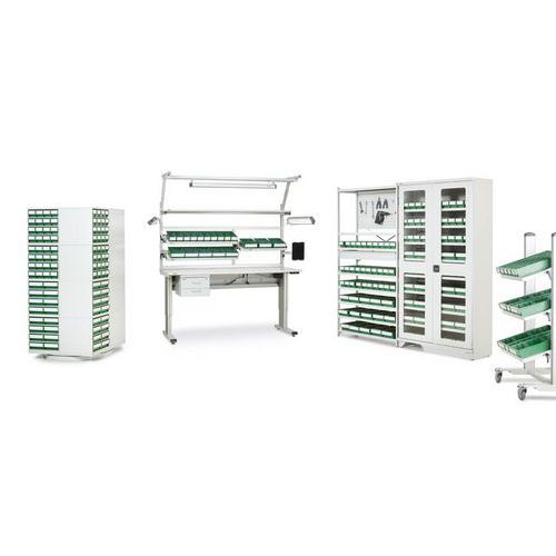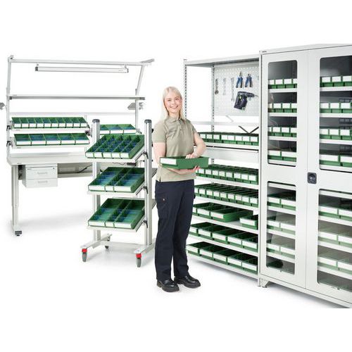 Et stort utvalg av oppbevaringsbokser for alt fra oppbevaring og håndtering av tunge gjenstander til organisering og bruk av svært små deler og komponenter. Slitesterke, håndtaksutstyrte oppbevaringsbokser som stables fast og har dimensjoner i henhold til det metriske hyllesystemet Pick-bokser kan veggmonteres med skuffeskinner eller plasseres i stativer på arbeidsbordet. De står også stødig direkte på arbeidsbordet og risikerer ikke å velte når de strekker seg etter komponenter. Avrundede innerhjørner og en spesialdesignet forkant gjør det mulig å raskt plukke opp deler. Gjennomsiktige små bokser egner seg til arbeidsbord eller oppbevaringsbokser, selvklebende etiketter er standard og skillevegger finnes som tilbehør. Alle boksene over kan også fås med ESD-beskyttelse.