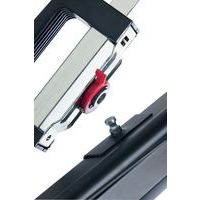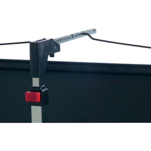 Matt hvit prosjektorduk på høydejusterbart stativ. Solid stålramme med plastender. Stabilt stativ i sortlakkert aluminium. Strekkmekanisme for jevn duk. Med støttearm og bærestropp for enkel transport. Trefotstativ, gulvflate 81 x 70 cm.