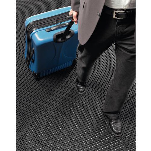 Si farvel til smuss, støv og rusk – ringgummimatte for offentlige områder som kan plasseres i en nedsenkning eller direkte på bakken. Matten er laget av en ekstra slitesterk gummiblanding som tåler intens fottrafikk, er enkel å rengjøre og praktisk talt værbestandig. Utmerket drenering takket være de hevede knottene på undersiden som lar vann renne fritt bort. Matter i Oct-O-Flex-serien har en glatt overflate med små hull, oppfyller EU-krav for offentlige innganger og er spesielt utviklet for miljøer der rullestoler, trillekofferter, staver eller krykker brukes. Som tilbehør finnes koblingselementer for å koble sammen flere matter, samt runde minibørster for Oct-O-Mat-serien (med store hull).