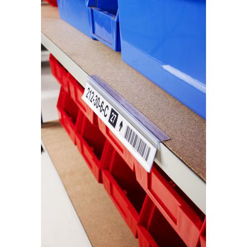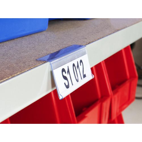 Den selvklebende billettholderen henger i vinkel fra hyllen for å sikre optimal synlighet, slik at operatører eller kunder kan ha en klar oversikt over informasjonen den inneholder.
