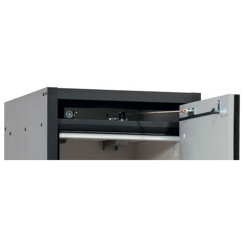 Sikkerhetsoppbevaringsskap Q-CLASSIC-30 Sikker og godkjent oppbevaring av brennbare stoffer i arbeidsområder Robust konstruksjon og levetid: trippellåst dør, skapkropp laget av melaminharpiks og flammehemmende spesialplater, sikkerhetselementer montert utenfor skapet for økt beskyttelse mot korrosjon, dører med metallfront samt ripe- og slagbestandig overflate, lett å rengjøre Enkel håndtering med komfort: dør stopper i hvilken som helst posisjon, selvlukkende i tilfelle brann Ingen uautorisert bruk: dør kan låses med profilsylinder (integrasjon i et eksisterende låsesystem mulig) Enkel transport: integrert transportbase med avtakbart, valgfritt basedeksel eller justeringshjelpemidler med basedeksel Ventilasjon: integrerte ventilasjonskanaler for tilkobling (DN 75) til et teknisk eksosystem Produsert i Tyskland Maksimal last (kg) : 600