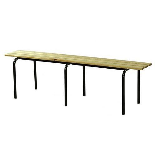 - Frittstående sittebenk med ramme av stålrør. Bena er pulverlakkert i svart farge og utstyrt med plastføtter. Setet er av løvtreribber.