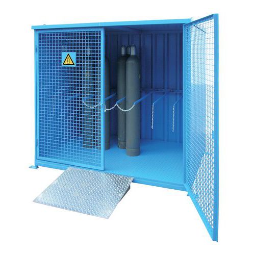 - Dette betyr at skap og beholdere for gasflasker er beregnet for utendørs bruk og oppfyller kravene i TRGS 510 for et utendørs lager.
