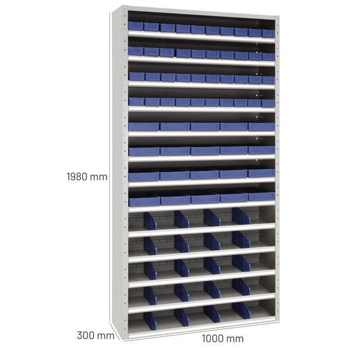 | Varenavn | Skap med rom og skuffer 198 x 100 x 30 cm, Materiale: Stål, Totalhøyde: 1980 mm, Totalbredde: 1000 mm |