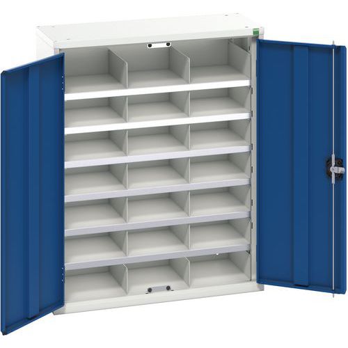 Låsbart skap i stålplate med rom. Ideelt for post, dokumentoppbevaring, lager osv. Rom med mål LxBxH 235x310x100 mm. Forsterkede dører, 3-punktslås med rigel. Belastningskapasitet 60 kg per hylle. Produsert i Storbritannia Maksimal last (kg) : 1000 Maksimal vekt per hylleplan (kg) : 75
