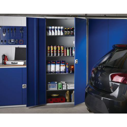 Sveiset stålplatekonstruksjon. Forsterkede dører med 3-punkts låsing. Ventilerte dører for god ventilasjon og sikt over innholdet. Laget i UK Maksimal last (kg) : 1000 Maksimal vekt per hylleplan (kg) : 75