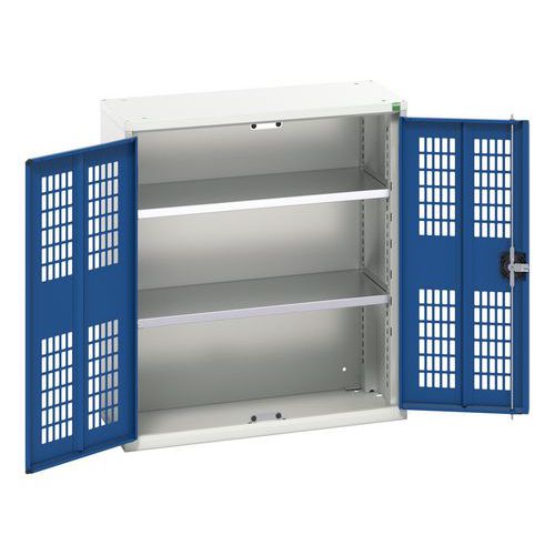 Sveiset stålplatekonstruksjon. Forsterkede dører med 3-punkts låsing. Ventilerte dører for god ventilasjon og oversikt over innholdet. Hyller i galvanisert stål, justerbare i trinn på 25 mm. Belastningskapasitet per hylle 60 kg. Sikkerhetsråd: - plasser møbelet på en flat overflate - fest det til en vegg eller skillevegg med egnede fester - pass på at du ikke overskrider den maksimalt anbefalte belastningen, samt at den er godt fordelt. Produsert i Storbritannia Maksimal last (kg) : 1000 Maksimal vekt per hylleplan (kg) : 75