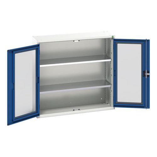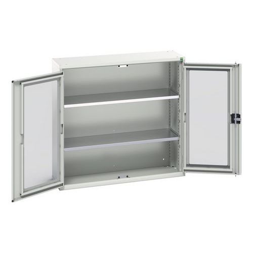 Verso-skap med gjennomsiktige dører. Med 2 hyller. 1050x350x1000. Produsert i Storbritannia Maksimal vekt per hylleplan (kg) : 75 Maksimal last (kg) : 1000