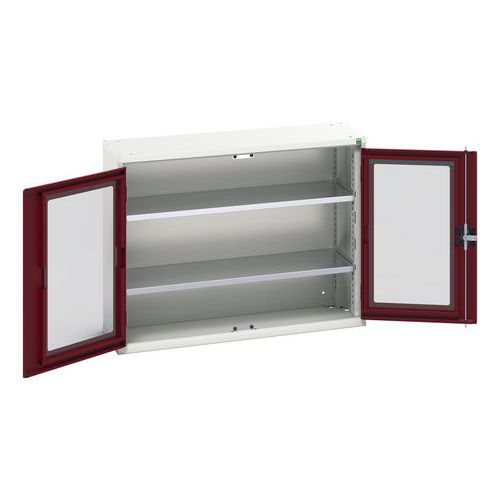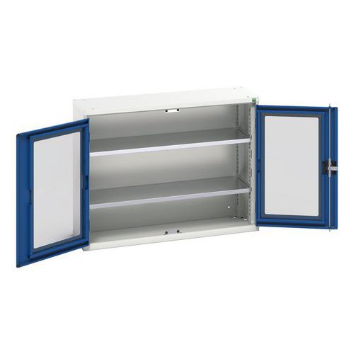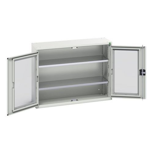 Verso-skap med gjennomsiktige dører. Med 2 hyller. 1050x350x800. Produsert i Storbritannia Maksimal last (kg) : 1000 Maksimal vekt per hylleplan (kg) : 75