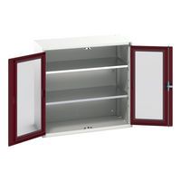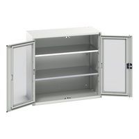 Verso-skap med gjennomsiktige dører. Med 2 hyller. 1050x550x1000. Produsert i Storbritannia Maksimal vekt per hylleplan (kg) : 75 Maksimal last (kg) : 1000