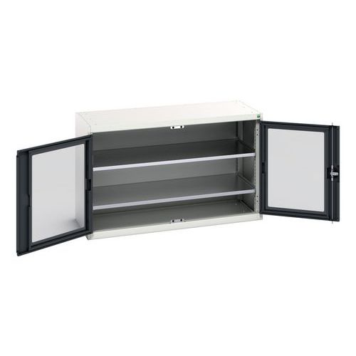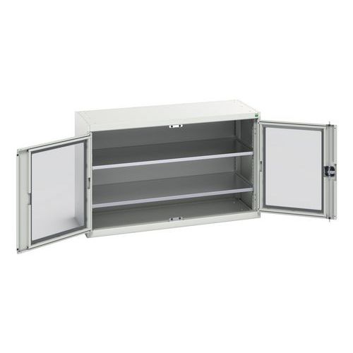 Verso-skap med transparente dører. Med 2 hyller. LxBxH: 1300x550x800mm. RAL 7035.