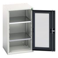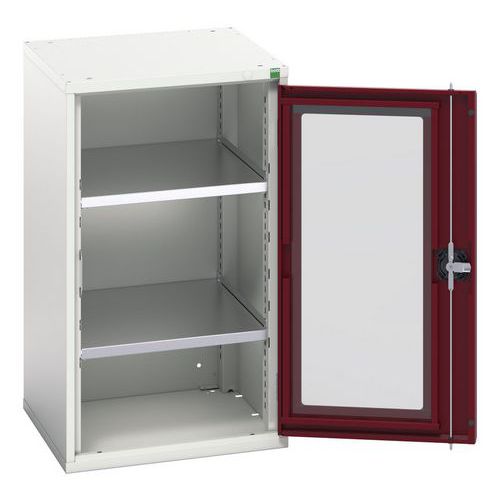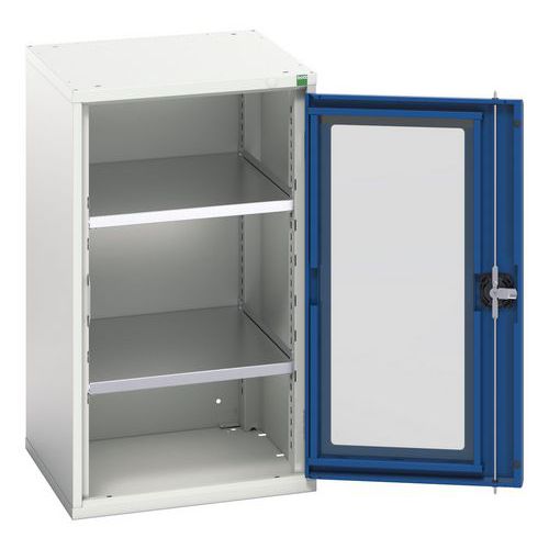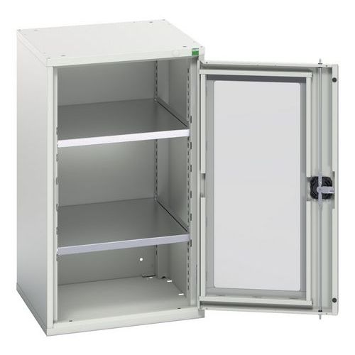 Verso-skap med gjennomsiktige dører. Med 2 hyller. 525x550x900. Produsert i Storbritannia Maksimal last (kg) : 1000 Maksimal vekt per hylleplan (kg) : 75