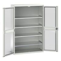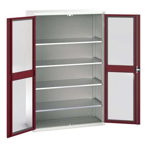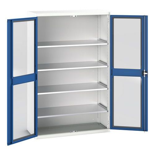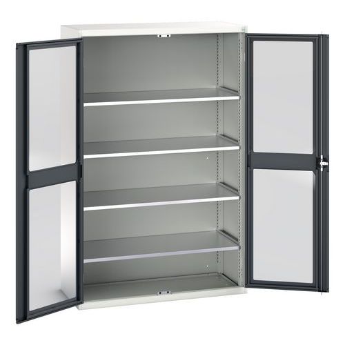 Verso-skap med gjennomsiktige dører. Med 4 hyller. 1300x550x2000. Produsert i Storbritannia Maksimal last (kg) : 1000 Maksimal vekt per hylleplan (kg) : 75