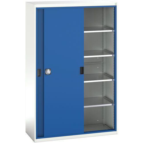 Verso garderobe med skyvedører. Med 4 hyller. 1300x550x2000. Skapet låses med nøkkel. Laget i UK Maksimal vekt per hylleplan (kg) : 75 Maksimal last (kg) : 1000