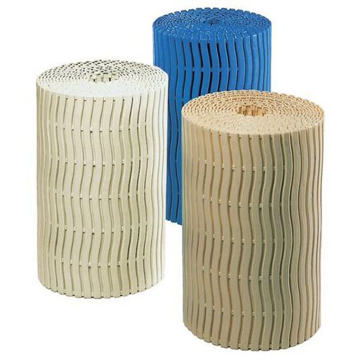 Sklisikker rist Soft-Step™ bredde 60 - Blå - Notrax. Drenerende overflate: intet stillestående vann. Deilig, varm følelse under foten. Hygieniske rister, enkle å vedlikeholde med vannstråle. Bølget mønsterdesign i antibakterielt behandlet polyetylen. Forhindrer spredning av sopp og bakterier. UV-bestandig. Produsert i EU Matte, bruk : Lett bruk Matte, tykkelse (mm) : 9