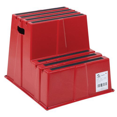 Enkel, komfortabel trappestige..Brede, sklisikre tråflater..Sikre gripestriper..Lett å gripe takket være håndtakene..Enkelt enhet, høy stabilitet..Alle Manutan-produkter er testet og godkjent av teamene våre. Sklisikker gummipute plassert under hvert hjørne av tråflaten.