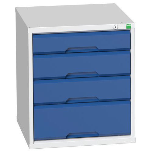 Toppen hviler direkte på et ben og en skuff. Skuffene er 525 eller 800 mm brede. Skuffer og dører er låsbare. Skuffer montert på kulelager. Skuffedelere som ekstrautstyr. Produsert i Storbritannia
