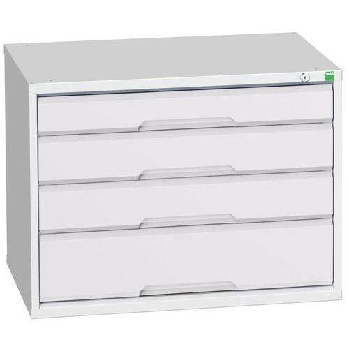 Toppen hviler direkte på et ben og en skuff. Skuffene er 525 eller 800 mm brede. Skuffer og dører er låsbare. Skuffer montert på kulelager. Skuffedelere som ekstrautstyr. Laget i UK