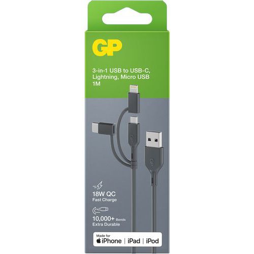 | Varenavn | Slitesterk 1-meters 3-i-1 USB-kabel, 18 W, USB-tilkoblingstype: USB-A USB-C 3.1 Lightning Micro USB |