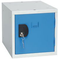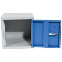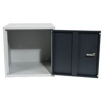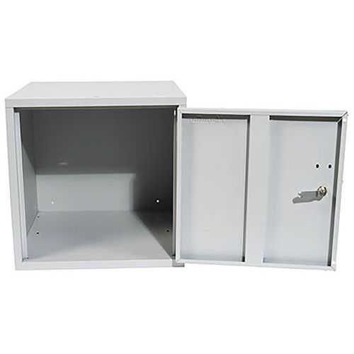 Kubeformet oppbevaringsskap med ferdigborede hull. 180° åpning med skjulte hengsler. Med sylinderlås. Leveres med etikettholder og 1 sett med 2 nøkler.