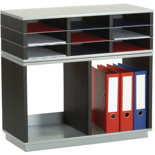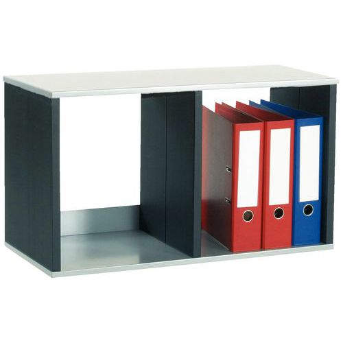 Polystyrenstruktur og metallhyller. Praktisk og robust oppbevaring med modulbaserte enheter. Flere kombinasjoner er mulige, avhengig av typen oppbevaring (flat eller vertikal). Mulighet til å stable åpne og lukkede horisontale oppbevaringsmøbler. Rom for A4-dokumenter som kan holde én papirbunke.