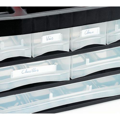 - Plasser skilleveggene på ønsket måte, og få oversikt over tingene dine. Gjennomsiktige skuffer med etikettholder.
