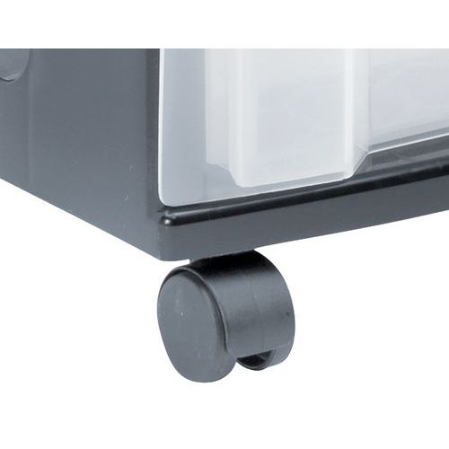 Meget letthåndterlig skuffeseksjon med 4 hjul. Gjennomsiktige skuffer for bedre oversikt over innholdet, og tett konstruksjon som beskytter mot støv. Perlehvite overflater på sidene for enkel merking.
