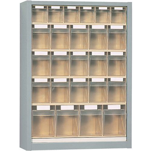- Det er enkelt å ta ut de gjennomsiktige vippeskuffene fra stålhyllen.