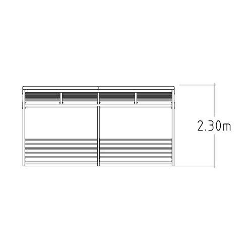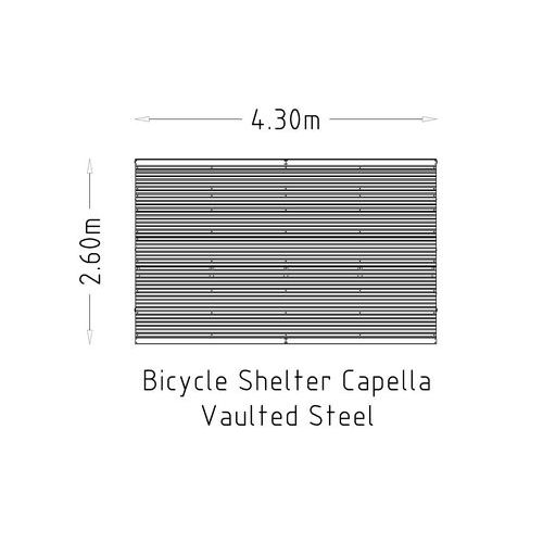 | Varenavn | Sykkelgarasje Capella, Totallengde: 4.3 m, Totaldybde: 2.6 m, Antall plasser: 12, Volum: 6.5 m³ |