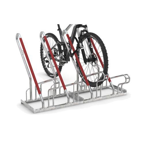 Den slående detaljen på dette frittstående sykkelparkeringssystemet er den diagonale rammestøtten som er kledd i signalrød plast og beskytter sykler mot utilsiktet hjulvridning og skader på felgen.