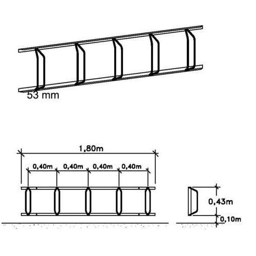 | Varenavn | Sykkelstativ veggmontert innkjøring rett frem 5 plasser, Totallengde: 1800 mm, Antall plasser: 5 |
