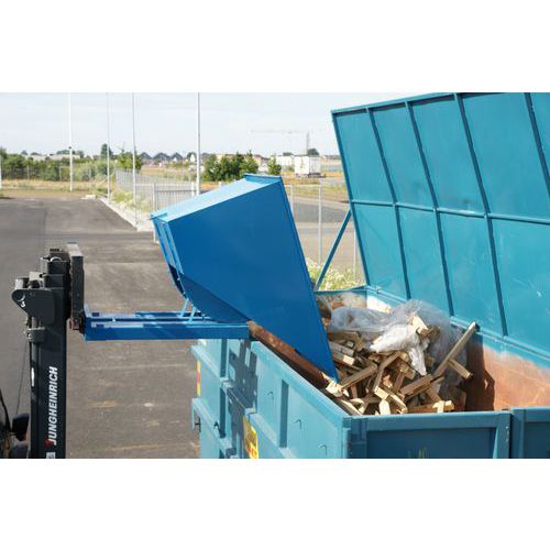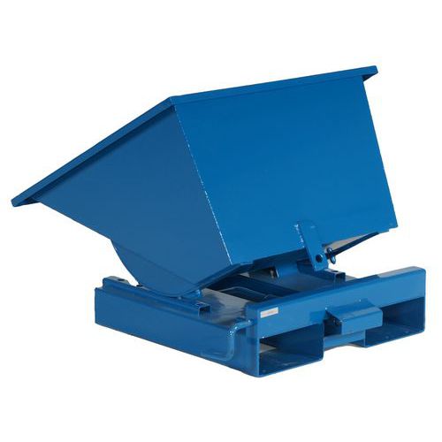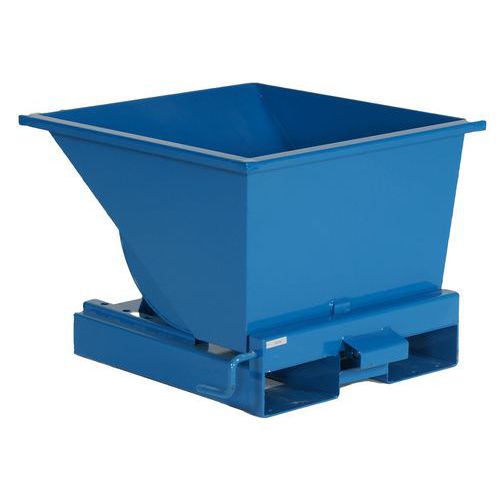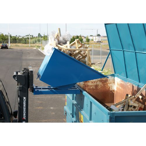 Tippcontainer som er kompatibel med de fleste trucker, jekketralle og stabler på markedet. Perfekt for kildesortering samt avfalls- og materialhåndtering i industri og verksted. Containeren har både manuell og automatisk tømming via en fjærbelastet trykkplate i understellet. Den automatiske tømmingen øker ikke bare effektiviteten, men også sikkerheten – containeren holdes trygt på plass takket være en motstøtte mot avfallsbeholderen. Robust konstruksjon med forsterkninger på strategiske punkter for å tåle tøff truckbruk. Pulverlakkert i blå (RAL 5019) for maksimal holdbarhet og sikkerhet, uansett miljø. Produsert i samsvar med EU-direktiv AFS 1994:48 / 98/37/EF. Tippcontainer Åpen finnes også i andre farger (brun, grå, grønn, gul, oransje, rød og hvit) – for å finne disse, søk på artikkelnummer: MIG4491004. Maksimal last (kg) : 2000 kg