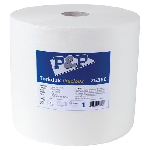 | Varenavn | Tørkeklut Precious, Farge: Hvit, Format, bredde: 30 cm, Lengde: 575 m, Ø: 32 cm, Lag: 1 |
