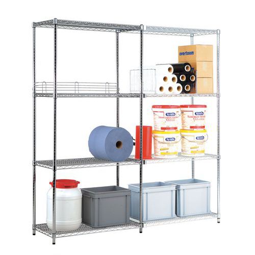 Grunnseksjon: består av 4 stolper, 4 hyller. Påbyggingsseksjon: består av 2 stolper, 4 hyller, 8 koplingskrok til hylleplater. Et pent og hygienisk modulbasert reolsystem med forkrommede hyller og galvanisert stativ. Ved å bruke trådhyller settes røykvarslere og sprinklerinstallasjonen raskere i gang ved brann enn ved vanlige oppbevaringssystem. Med et integrert håndtak kan hyllene lett justeres i trinn på 25 mm, og de kan høydejusteres uten at reolen demonteres. Stativene har dobbelt spor (hver 20. cm) og er derfor lette å identifisere. Ideelt til næringsmiddelindustrien, helsevesenet, butikker og alle lagerlokaler som skal være støvfrie. Quick-Store er svært lett å utvide. Koplingskrok til hylleplater = Brukes i påbyggingsseksjoner med hyllene på linje. Enkel hyllejustering uten demontering. Toppkvalitet og pen utforming.