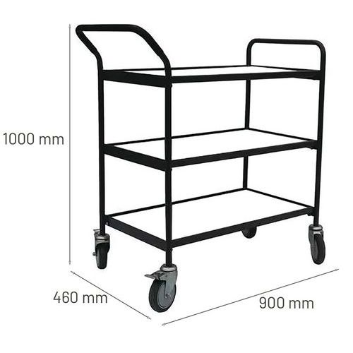 - Robust bordvogn/plukkevogn/servicevogn med trehyller (finnes med 2 eller 3 hyller) og ramme av stålrør.