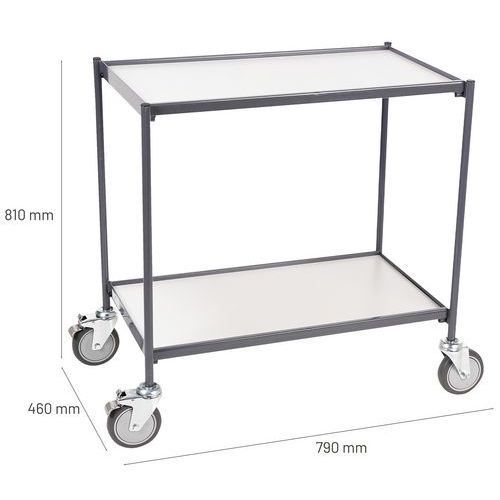 | Varenavn | Tralle med trehyller – kapasitet 200 kg, Hjul, Ø: 125 mm, Kapasitet: 200 kg, Totalhøyde: 810 mm |