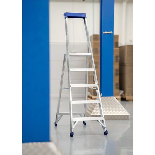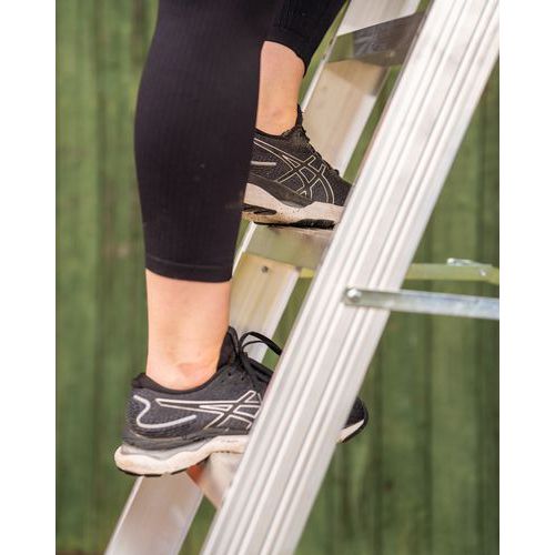 Trappestige 5050 er utstyrt med plastføtter som gir utmerket sklibeskyttelse og skåner underlaget, samt en praktisk verktøyhylle i plast.
