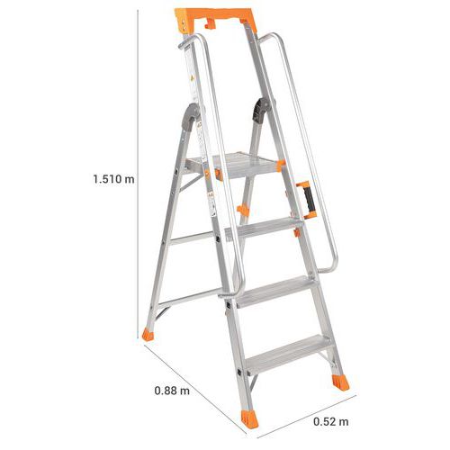 Profesjonell trappestige aluminium. Multifunksjonell verktøybord. Behagelig og sikker med rampe. Forsterkede aluminiumsprofiler. Sklisikre trinn. Lett å transportere, oppbevare. Garanti (år) : 10 år Maksimal last (kg) : 150 kg