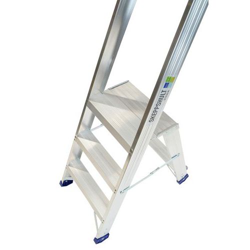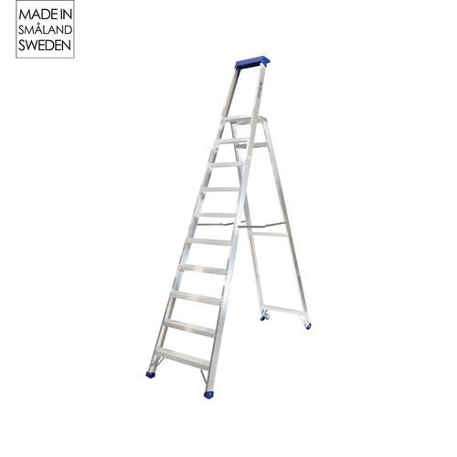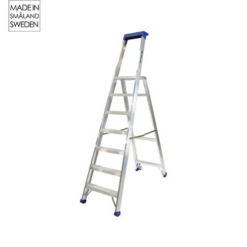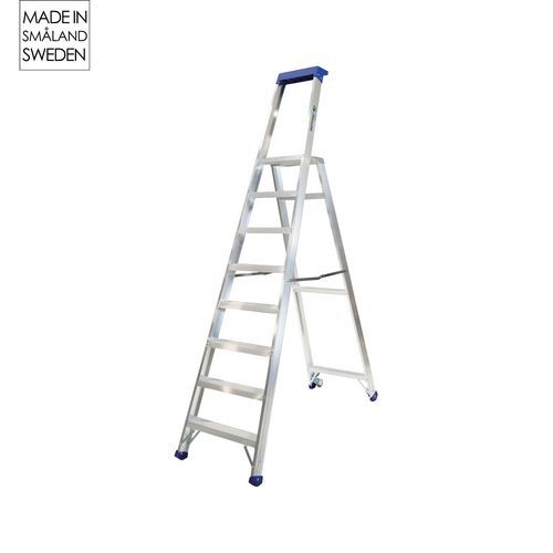 Trappestige 3350 - en robust trappestige laget av aluminium, perfekt for krevende arbeidsmiljøer. Stigen har hydraulenittede trinn og en stabil plattform for ekstra sikkerhet. Den er utstyrt med en verktøyhylle i plast og plastføtter for å forhindre sklifare og beskytte underlaget. Modellen har hjul på de bakre benene for enkel flytting. Tilbehør som stigebredder og håndlister er tilgjengelige, og alle stiger er godkjent i henhold til AFS 2004:3 og EN-131. Trappestige 3350 med 3-, 4- og 5-trinn oppfyller kravene i Bra arbeidsmiljøvalg. Hva innebærer Bra Arbeidsmiljøvalg? Bra Arbeidsmiljøvalg er et sertifikat, utarbeidet av Riksbyggarnas sikkerhetsgruppe i Sverige, for å skape tryggere stigeprodukter som oppfyller en høyt stilt kravspesifikasjon.