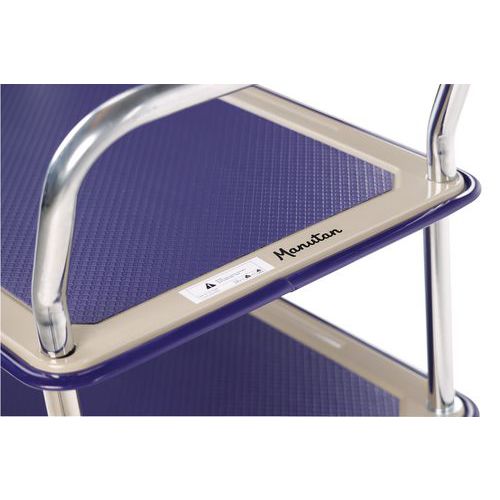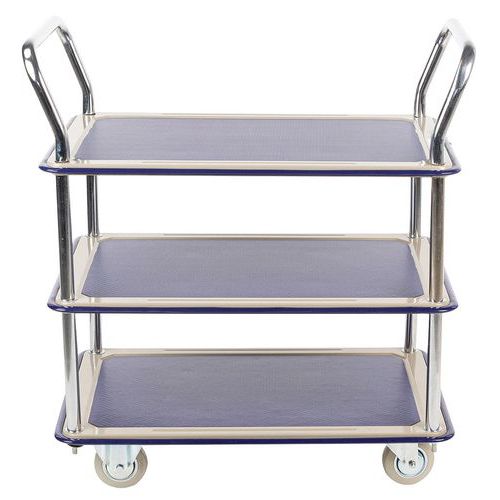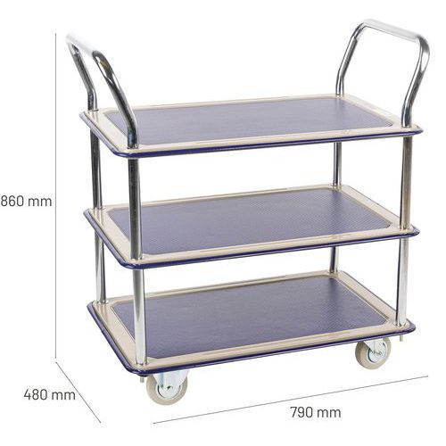 | Varenavn | Trillebord med 3 hyller 120 kg, Hjul, Ø: 100 mm, Kapasitet: 120 kg, Totalhøyde: 860 mm, Totalbredde: 480 mm |