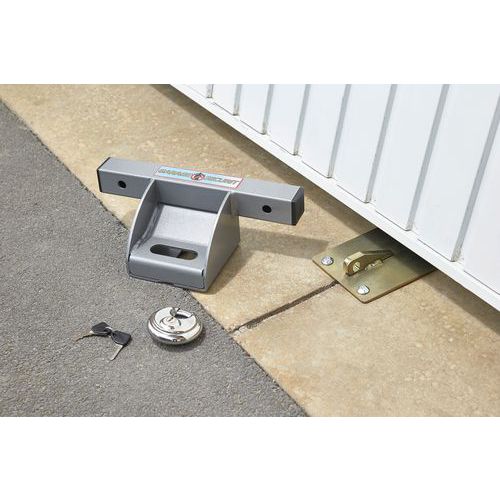Unngå garasjeportinnbrudd: to innvendige stopper festet til gulvet Utvendig dørstopper kan festes til garasjeporter som åpnes vertikalt ved hjelp av 2 bolter for å stoppe åpningen av denne typen dør.