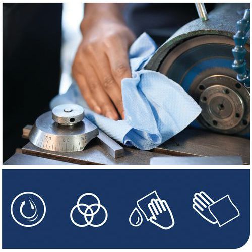 Papir med overlegen absorpsjonskapasitet. QuickDry-kvalitet: sterkere og mer absorberende enn vanlig papir. Beskytter hendene mot varme og smuss. Veldig effektivt for avtørking av olje. Veldig sterkt, selv i våt tilstand. Ergonomisk dispenserboks, lett å bære, åpne og kaste.