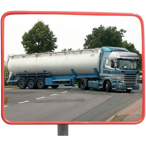 Industrisikkerhetsspeil for å øke sikkerheten i industriområder mm. Slitesterk og robust: testet for å tåle Beaufort 12-vind (orkanhastigheter over 117 km/t). Firepunkts montering på stang eller vegg med kuleledd for bedre justering. Rød ramme for å tiltrekke oppmerksomhet. Akrylspeil: sterkere enn glass. Utmerket bildegjengivelse uten forvrengning. Enkel å installere. Produsert i EU