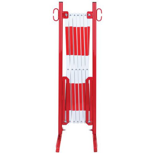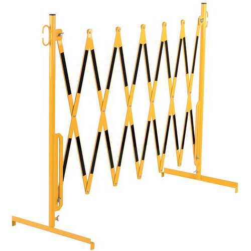 Utvidbar stålbarriere med føtter på begge sider som tillater midlertidig stenging av et farlig område. Fargevekslingen tiltrekker seg brukernes oppmerksomhet og signaliserer farer. Mulighet for å koble til flere bommer. Tar liten plass når den er foldet. TÜV-sertifikat.
