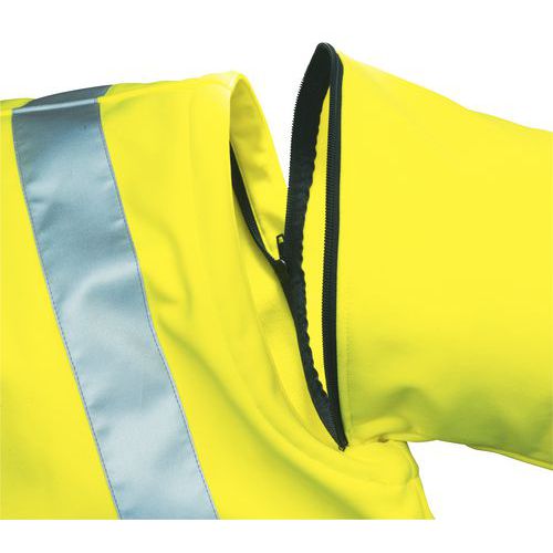 Glidelås helt til toppen av kragen. Regulerbare mansjetter med borrelås. Midjebeskyttelse. Jakke med løse ermer. Mange lommer. Stramming med strikk med snorstopp. Refleksbånd av typen 3M™ Scotchlite™. Rett, dobbel krage. CE