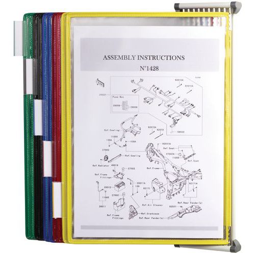 Tilpass stativet etter behov – mulighetene er uendelige! Veggstativet passer i alle rom. Gjør det enkelt å finne dokumentene dine ved hjelp av etikettholdere med forskjelligfargede innstikksark. Leveres med 10 presentasjonslommer i A4-format, 5 etikettholdere (50 mm) med ufargede og fargede innstikksark, 4 sidestøtter og monteringsmateriell. Laget i EU
