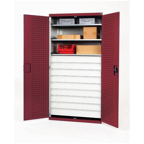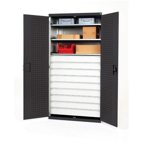 Svært robust verkstedskap. Skapet kan fås i tre fargekombinasjoner. Ferdige innredningskombinasjoner. Innredningen leveres montert i skapet. Innredning: 9 stk. skuffer høyde 125 mm med 100% skuffeuttrekk, 75 kg kapasitet. 3 stk. faste hyller med 100 kg kapasitet. Verktøypanel i dører